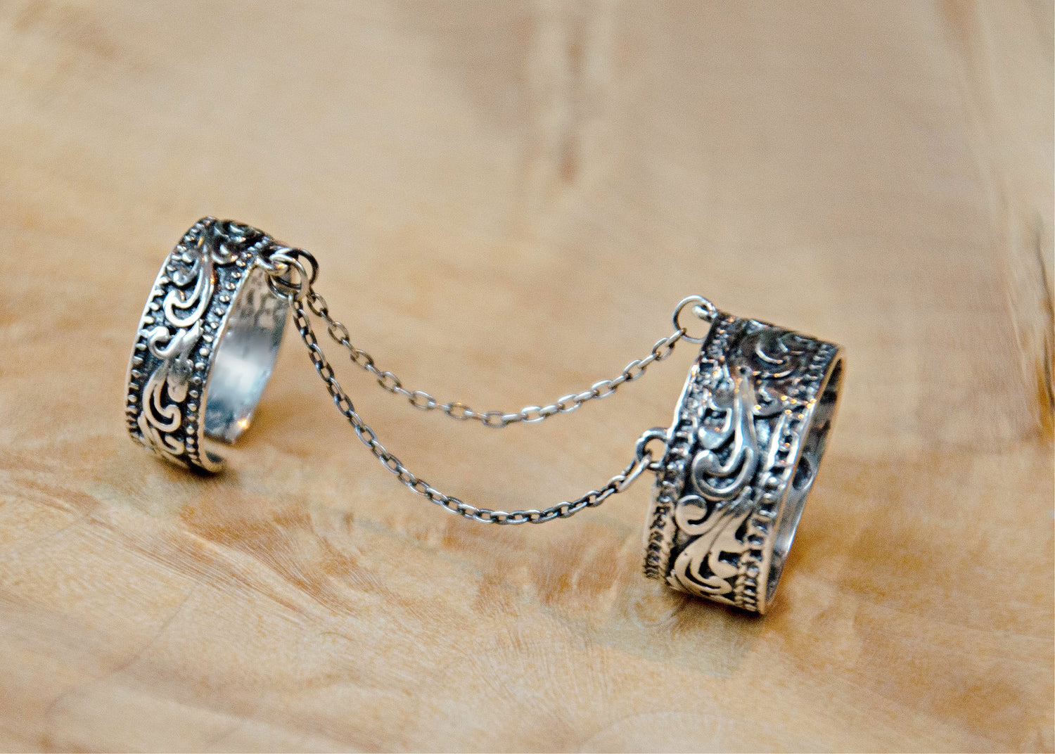 This double-ring features polished silver engraving accented by dark antiquing and connected by delicate twin chains.