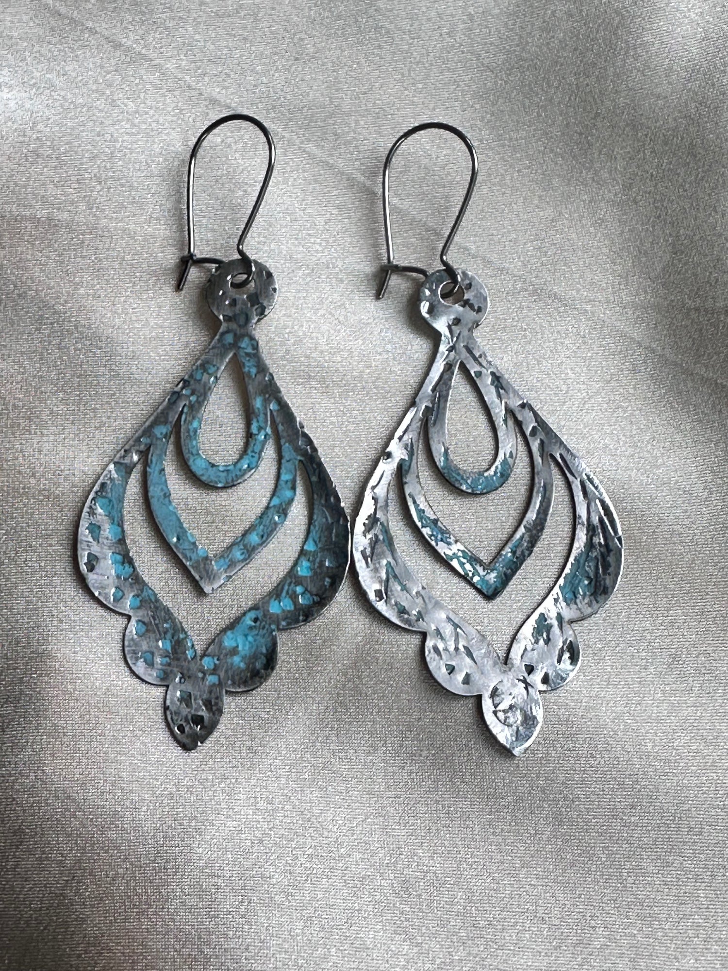 Beauty from a bullet - these delicate ajouré earrings fashioned from Hayar's signature bullet material is lightly accented with green patina.