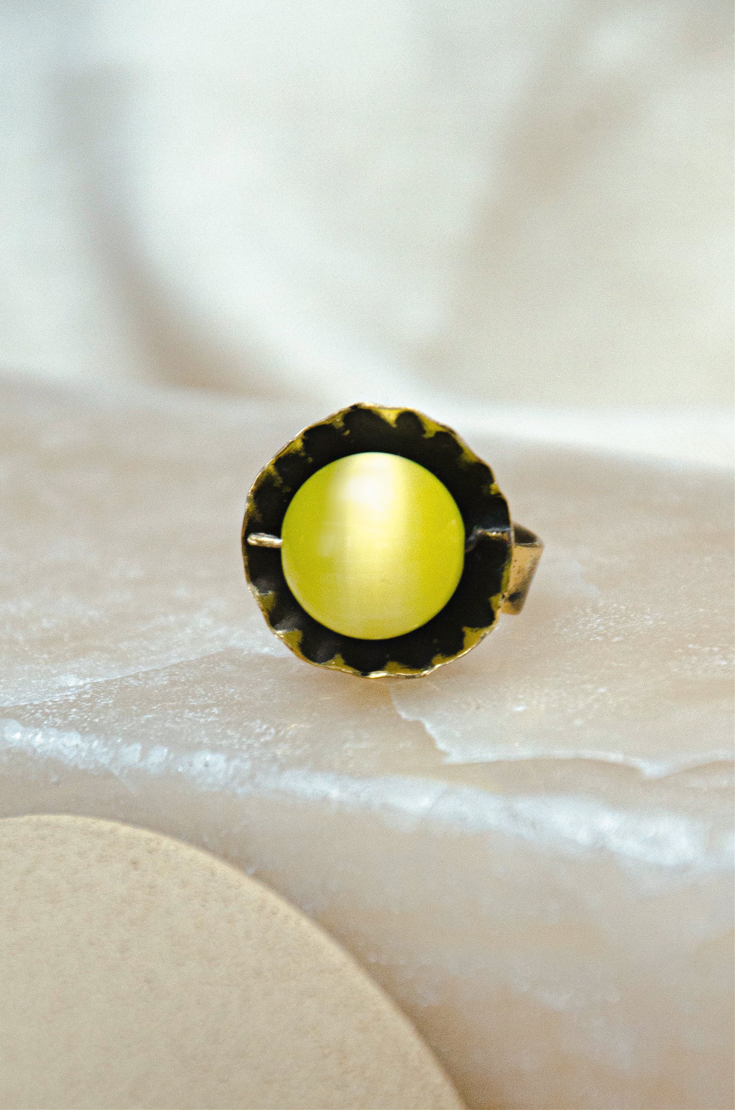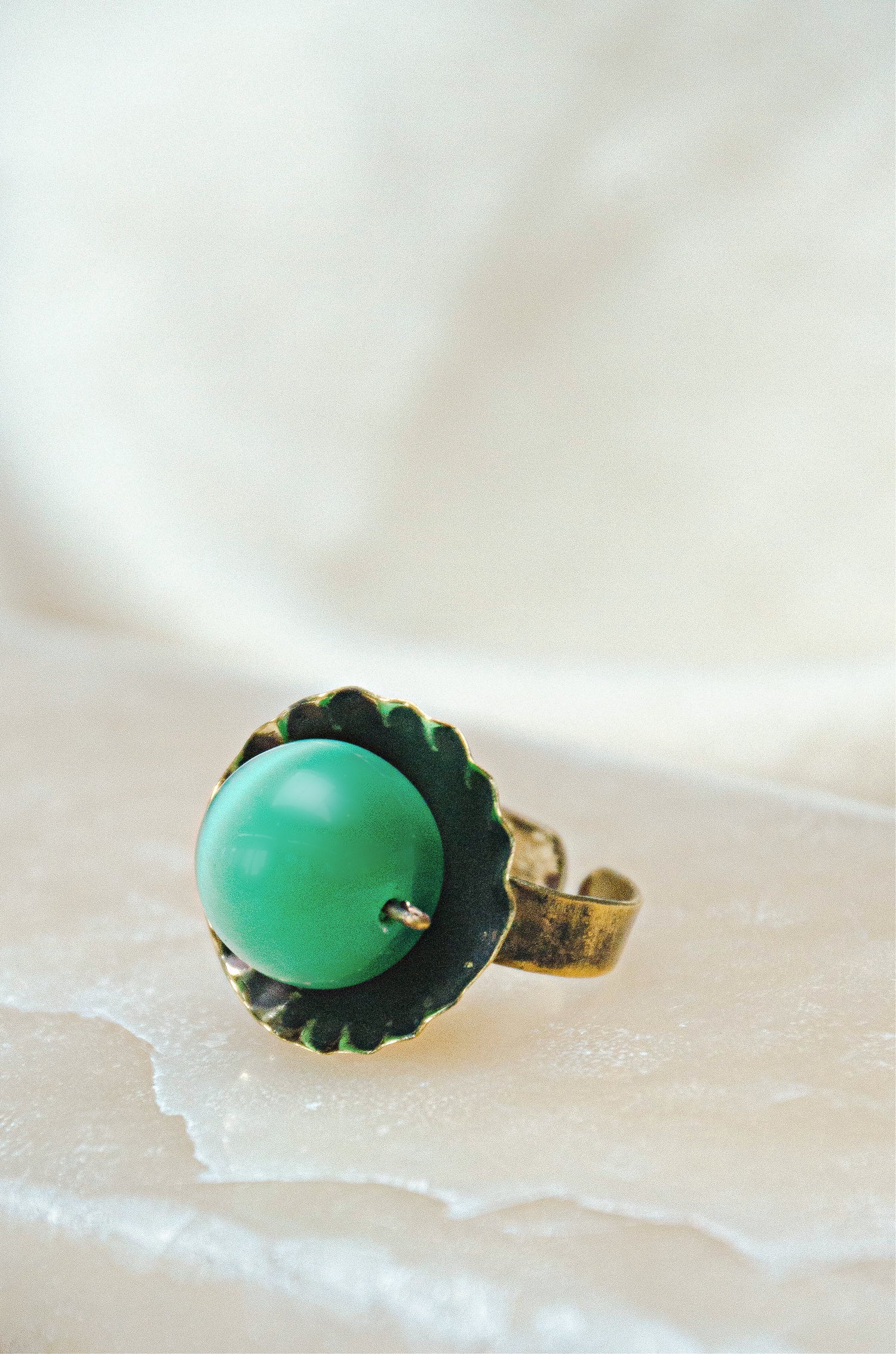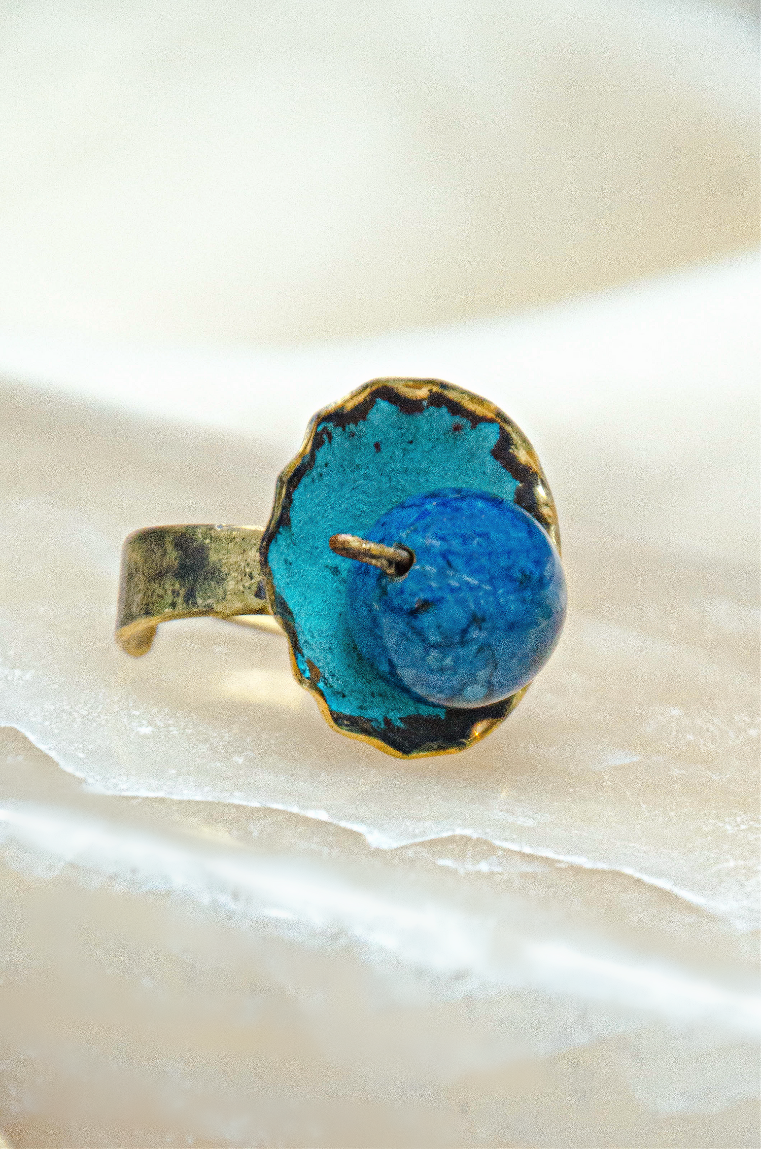 Beauty from a bullet - color agate spheres adorn a ring made from Hayar's signature material in these statement pieces.